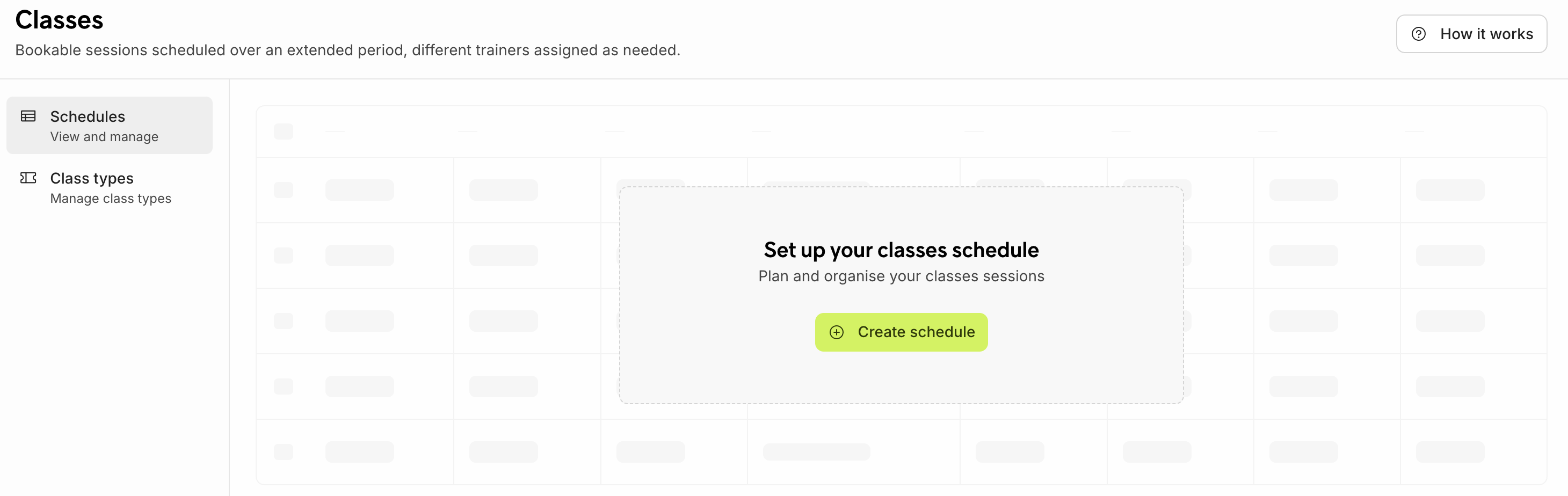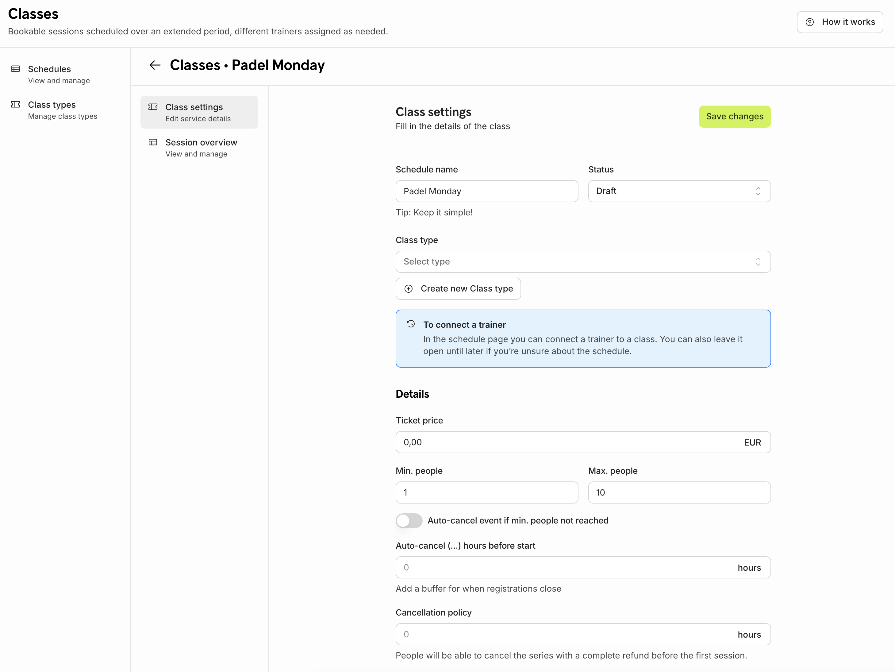 If you have no classes yet, the system will remind you on creating one. First, you will have to go to 'Schedules' and create one. Click on the green button to start.
