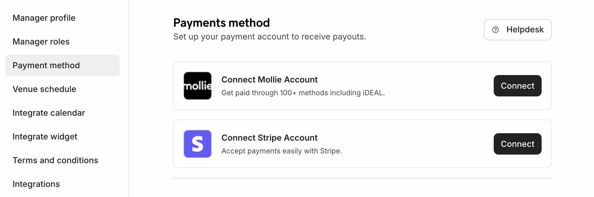 Important: Setting up your payment method is required before you can accept bookings and before clients can make payments.