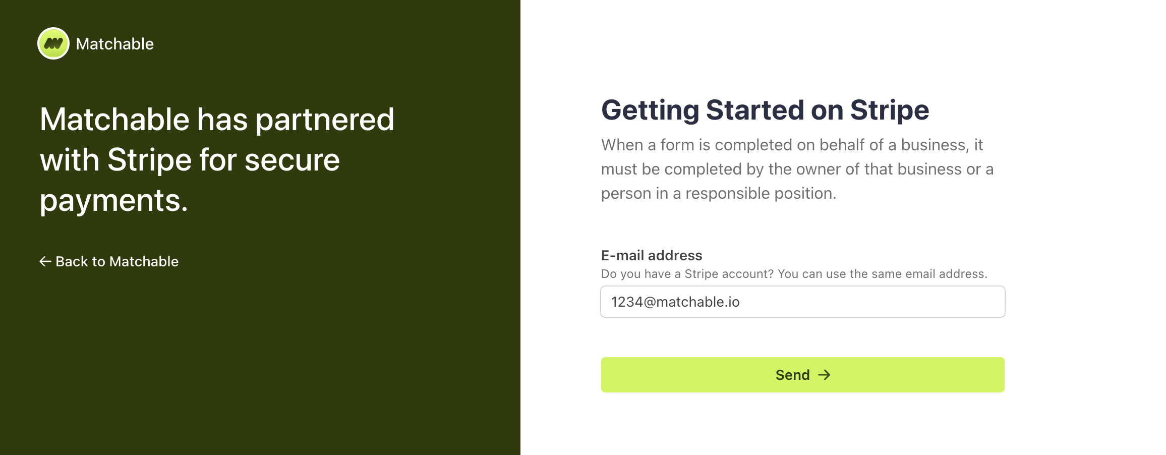 3. When selecting Connect (e.g. Stripe Account), you will be directed to the Stripe onboarding page. Sign in with your existing account or create one by entering your email address and password. Follow the instructions from Stripe to complete your payment account.