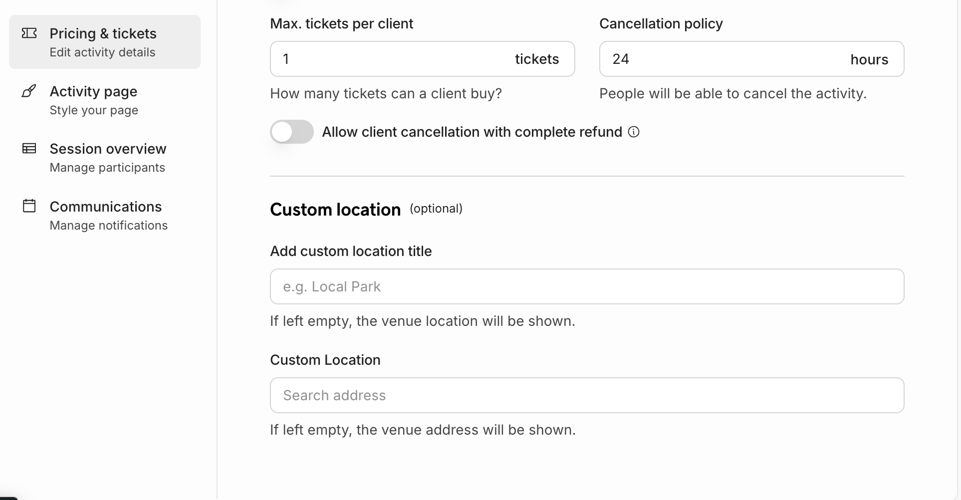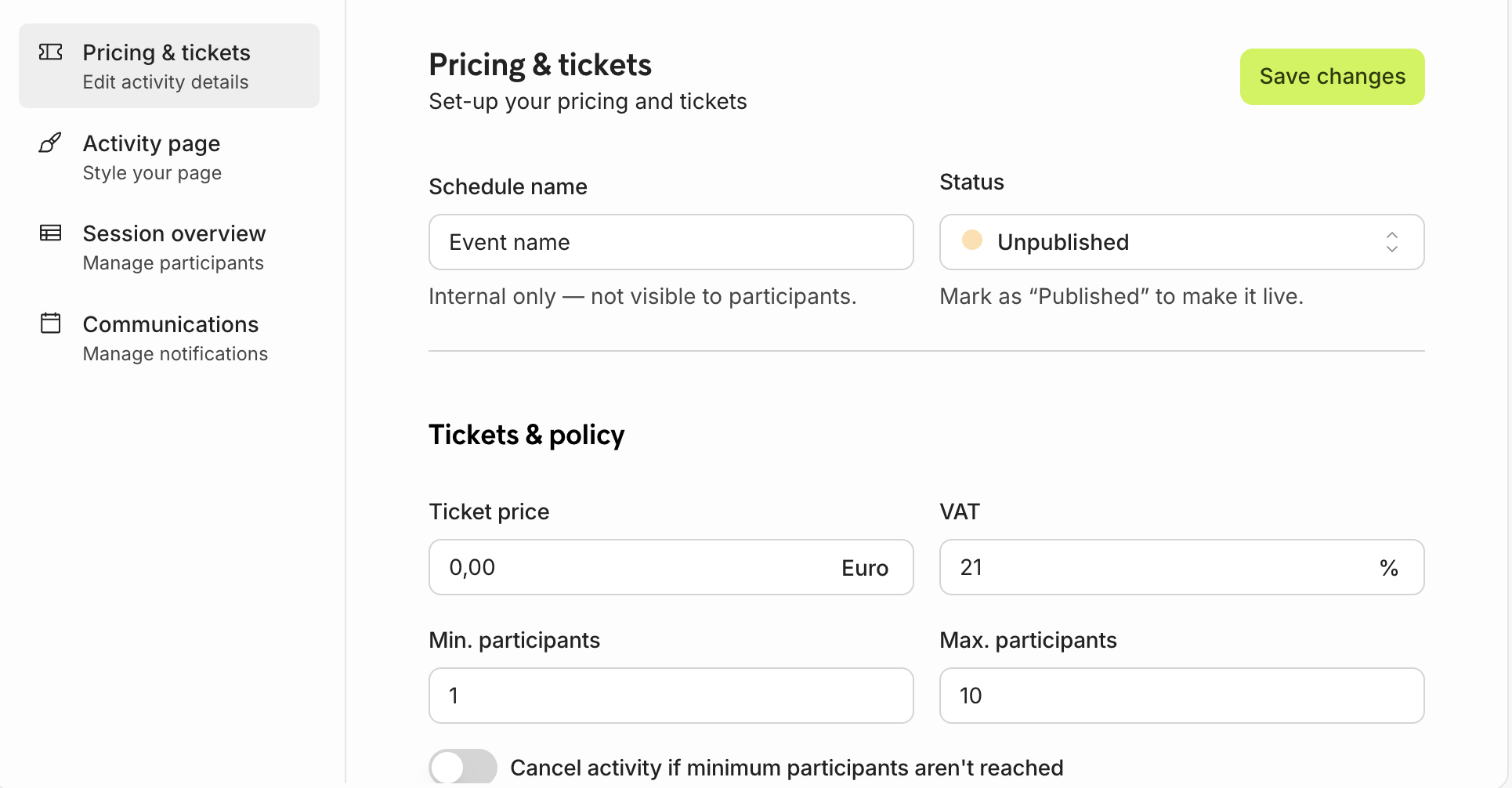 3. Fill in all the details, from ticket prices to VAT, the number of participants that are allowed to buy tickets and the cancellation policy. Don't forget to add the location of the event venue if it differs from your own and Save changes once you're done.
