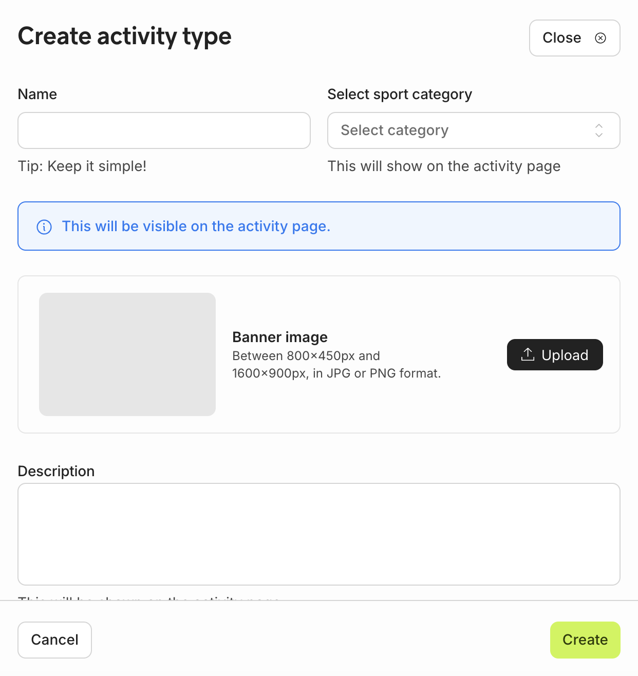 2. Fill in the Name of the event and Select sport category e.g. padel and upload a nice Banner image and add a Description of the event, so that people will know what the event is about. Click on the green Create button to save.