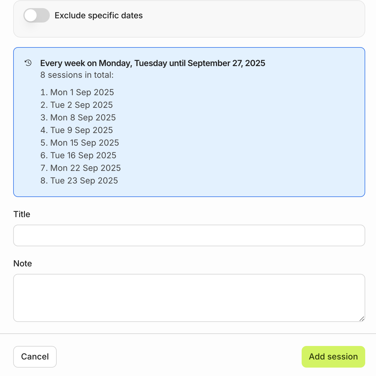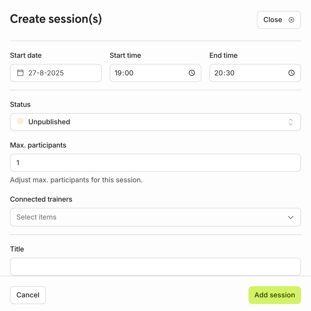 2. Fill out all required fields e.g. Start date, time, participant etc. and save the information by clicking Add session. Once completed, the session will be visible on the Matchable website for clients.