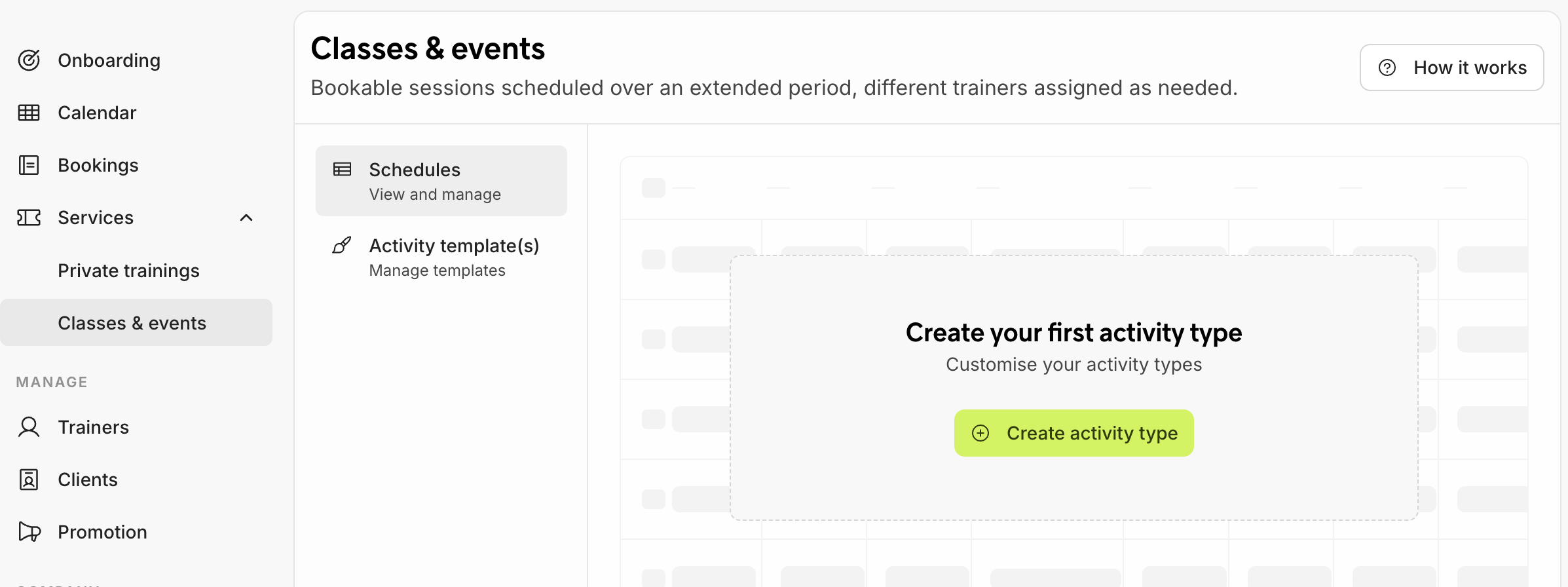 1. Navigate in Manager to Services on the left and then select Classes & events to create your first event and click on Create activity type.