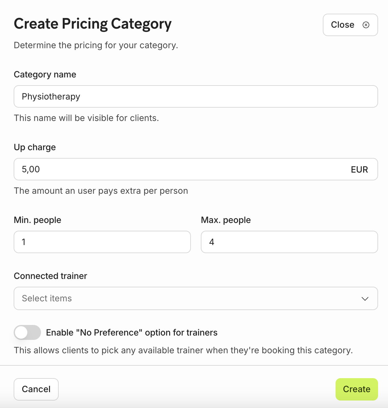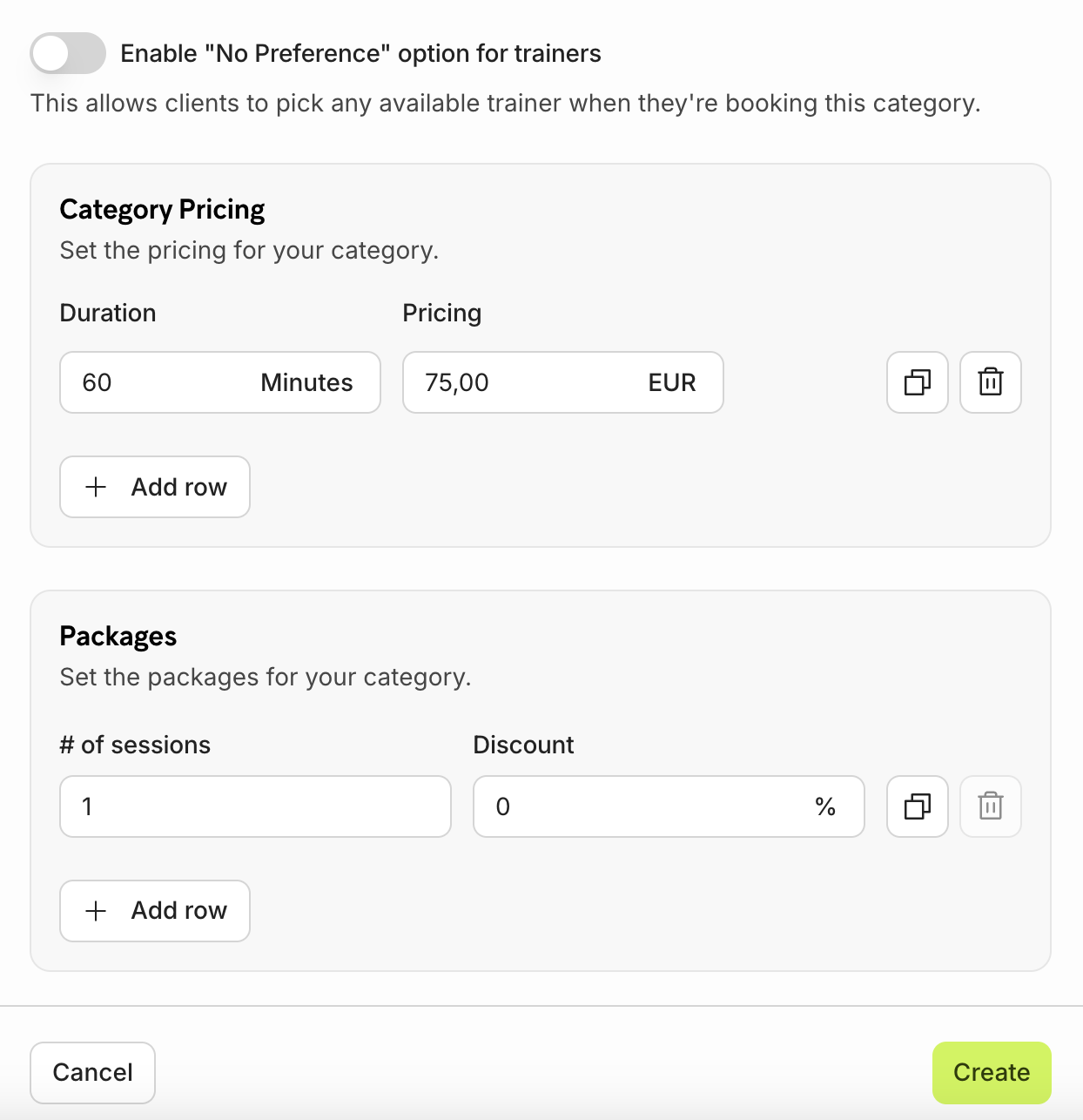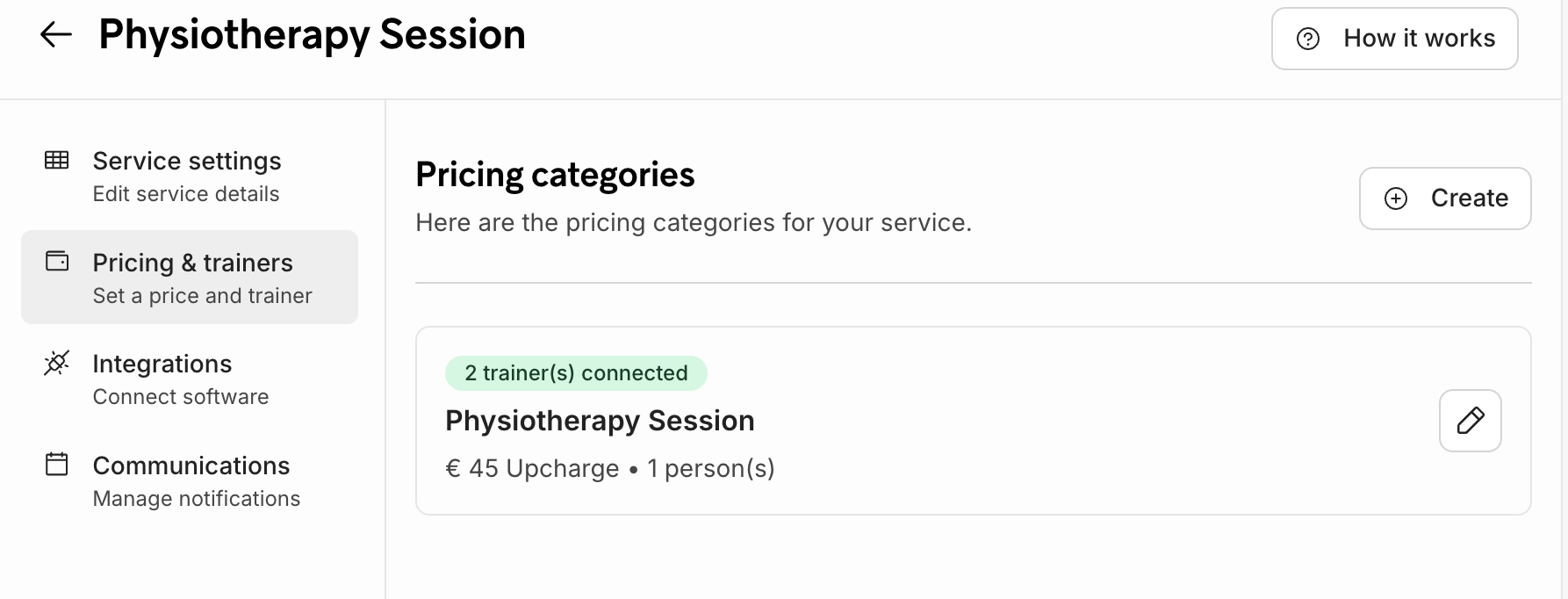 - Select Pricing categories and click Create to set-up your pricing, how many people can book the service, which trainer you’d like to connect the service to, duration of the training, price per session and add any packages if applicable. Select Create to save all the information.