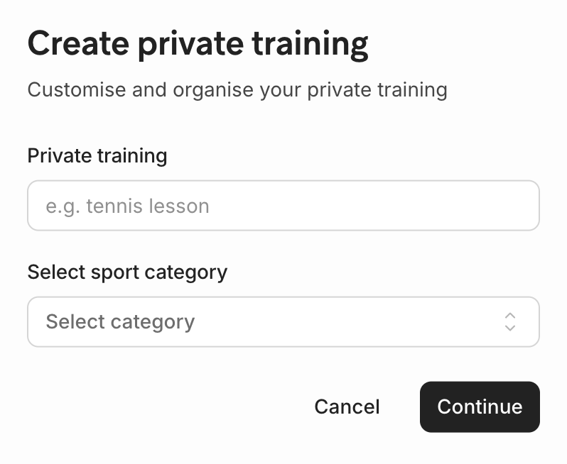 - Name your training and select a sport e.g. padel or physiotherapy session and click to Continue to save.