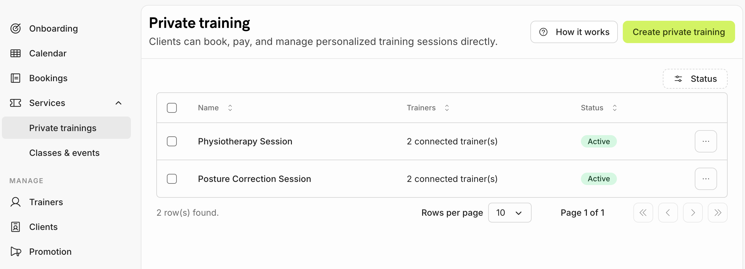 After you’ve set up your trainers, you can start creating classes and trainings. In this article, we specifically look into private trainings.