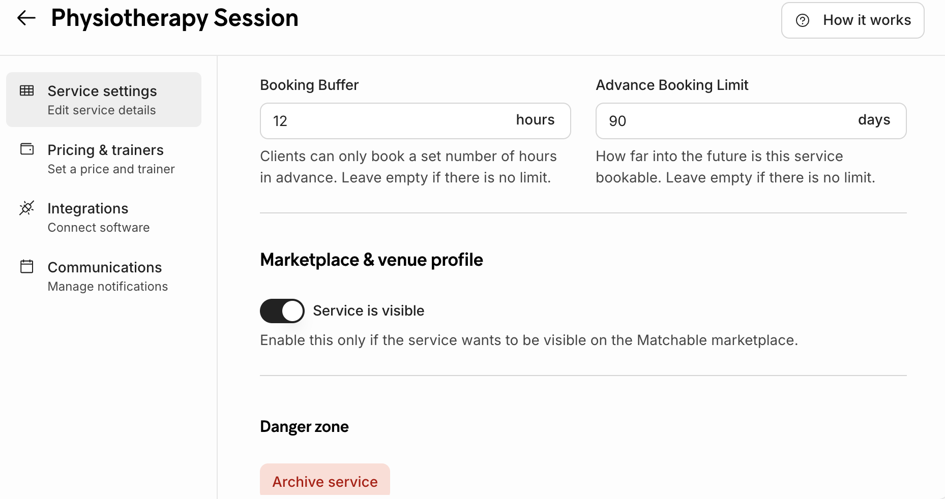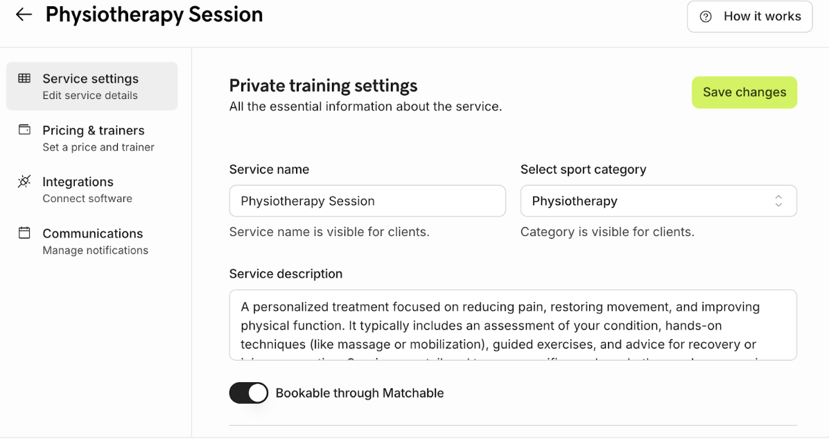 - On the left you will find the Service settings, where you can fill in the Service description of your private training.