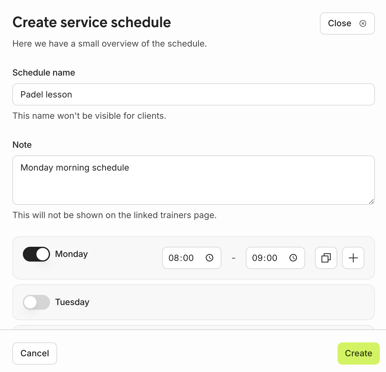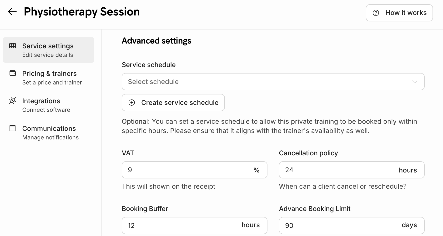 - In the Advanced settings below you can set up your trainer’s availability by selecting Create service schedule. Fill in the details of the training, the weekday and the time.